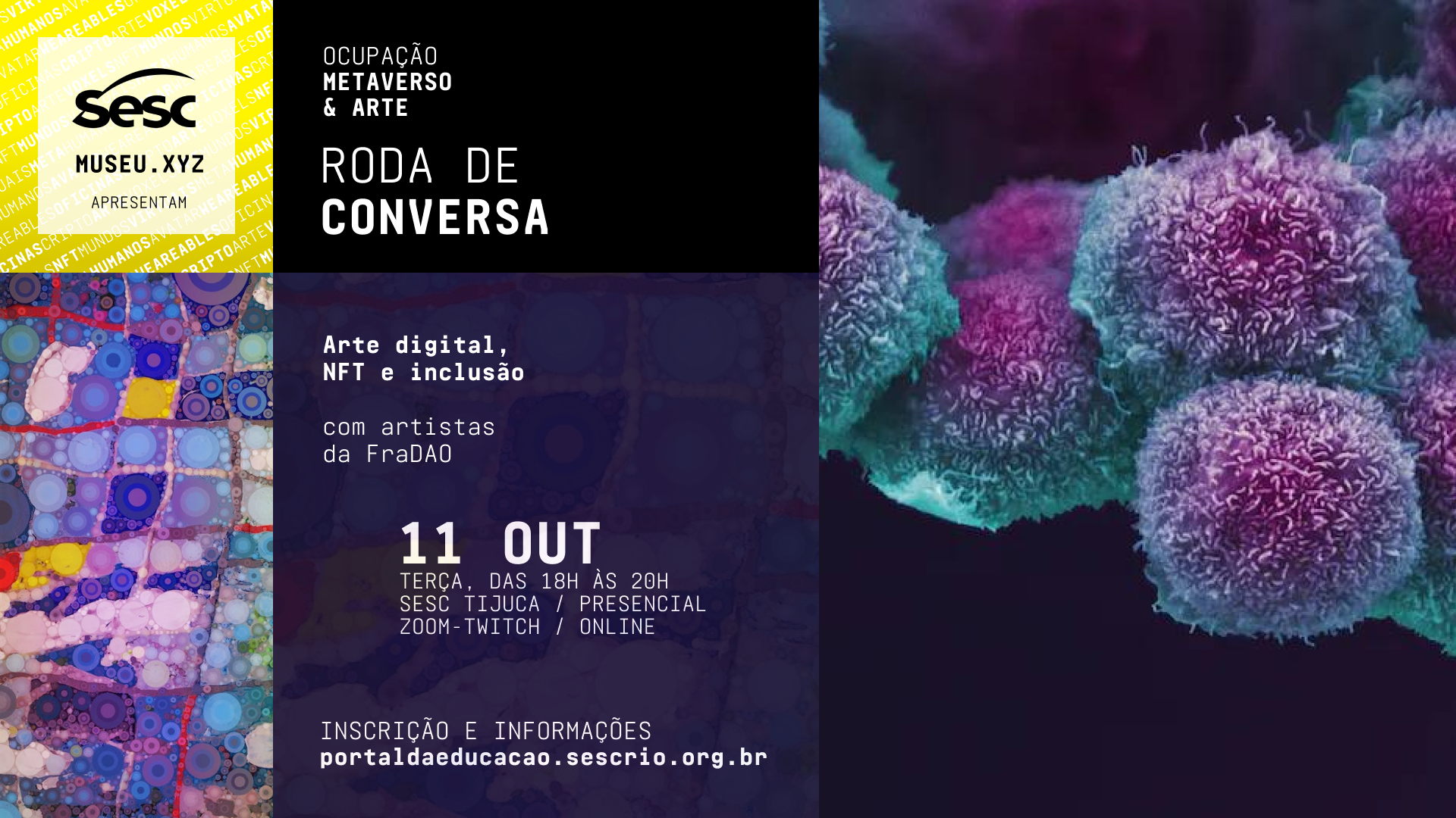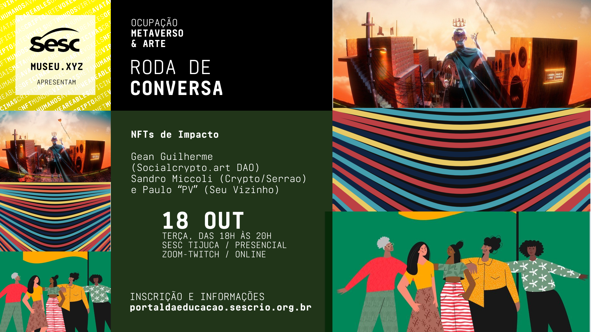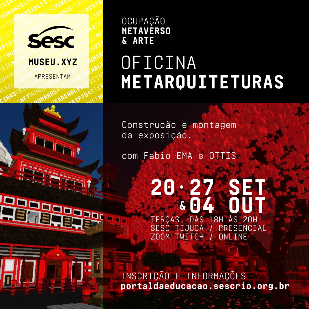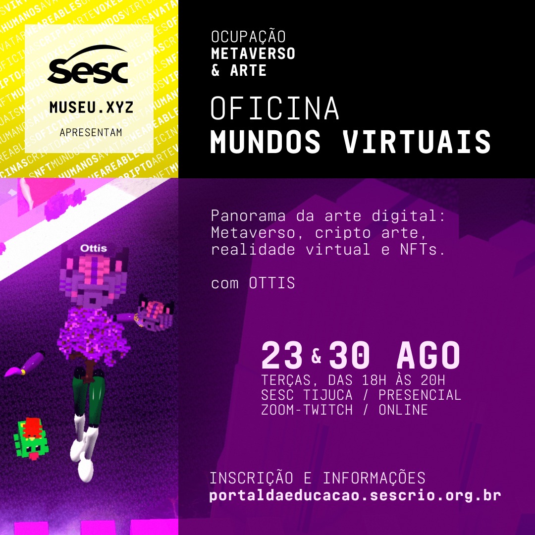 A Ocupação Metaverso & Arte foi um projeto híbrido realizado pelo Sesc RJ e produzido pelo Museu.xyz. Contemplou a realização de uma exposição virtual no DistritoXYZ a partir de uma programação colaborativa de oficinas e um programa de rodas de conversas sobre a temática do universo do metaverso.