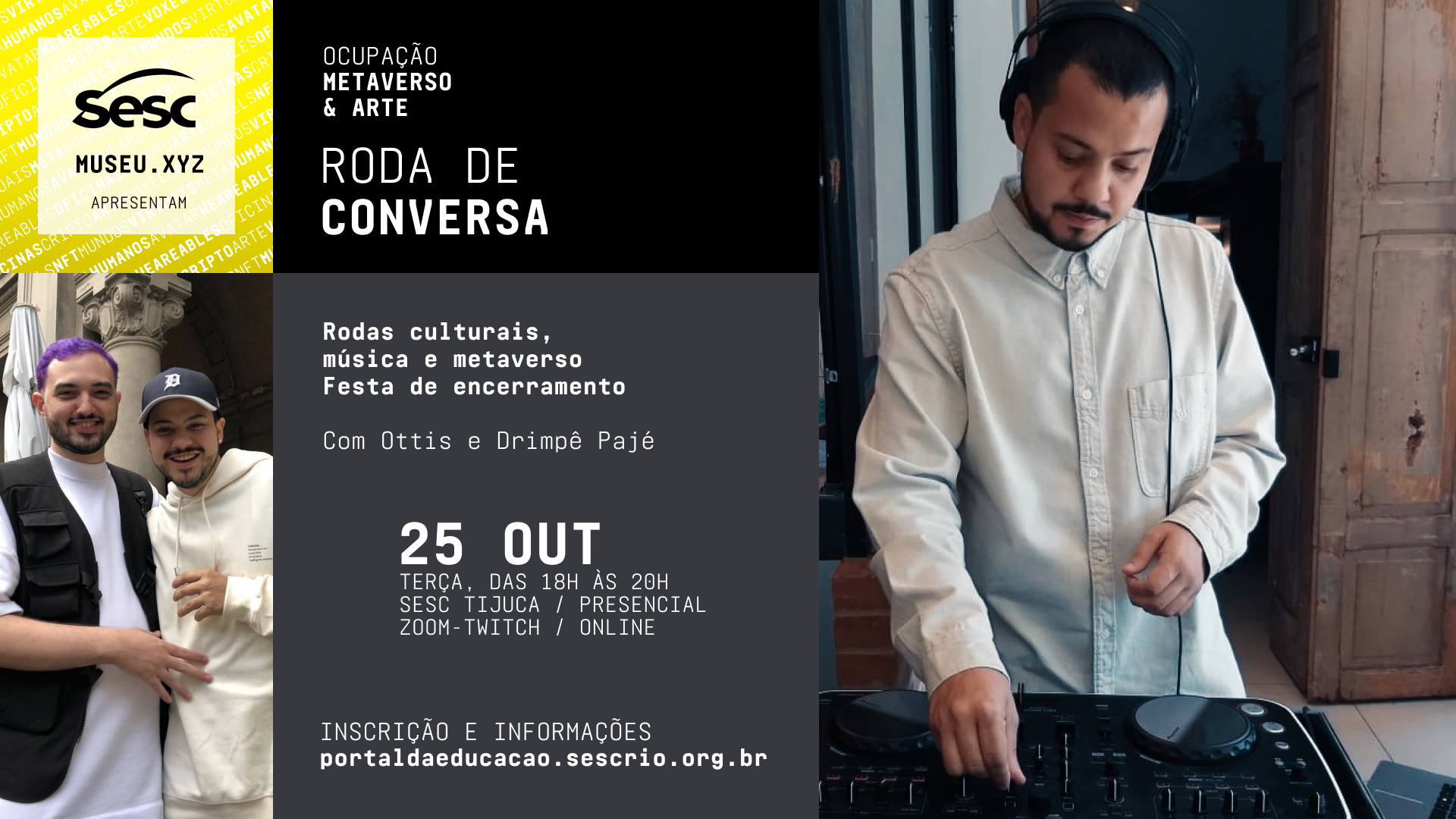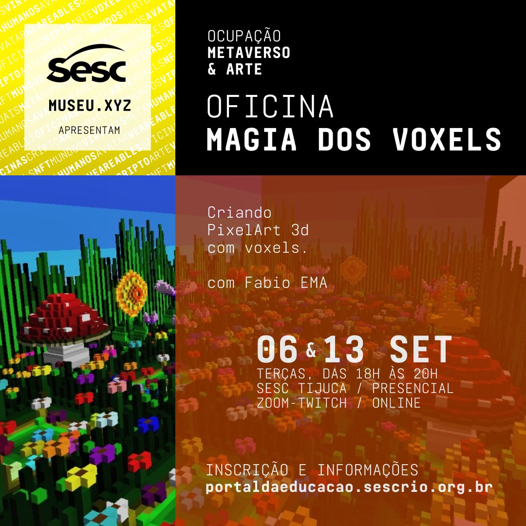Gostaria de dar seus primeiros passos no metaverso? Venha participar de nossas atividades, presencialmente no Sesc Tijuca ou virtualmente no MUSEU.XYZ, e construa conosco o DistritoXYZ!