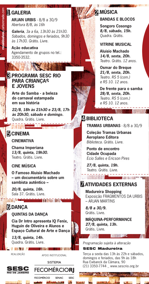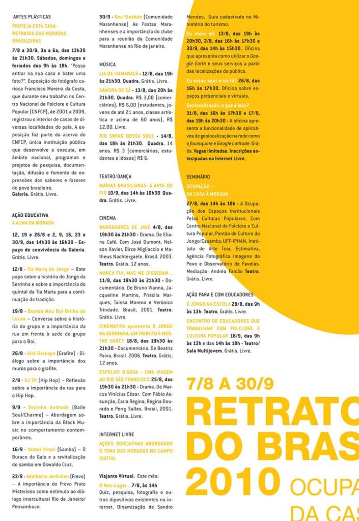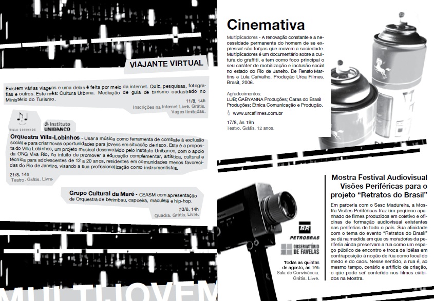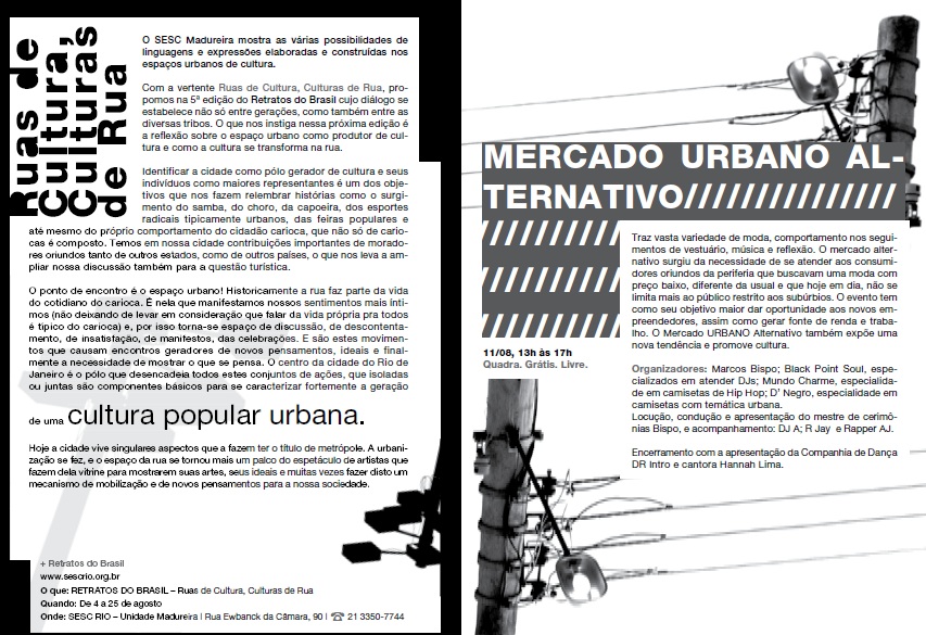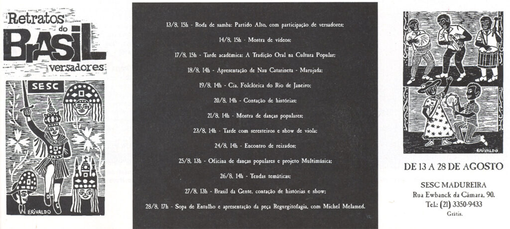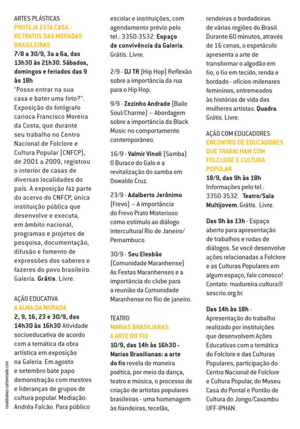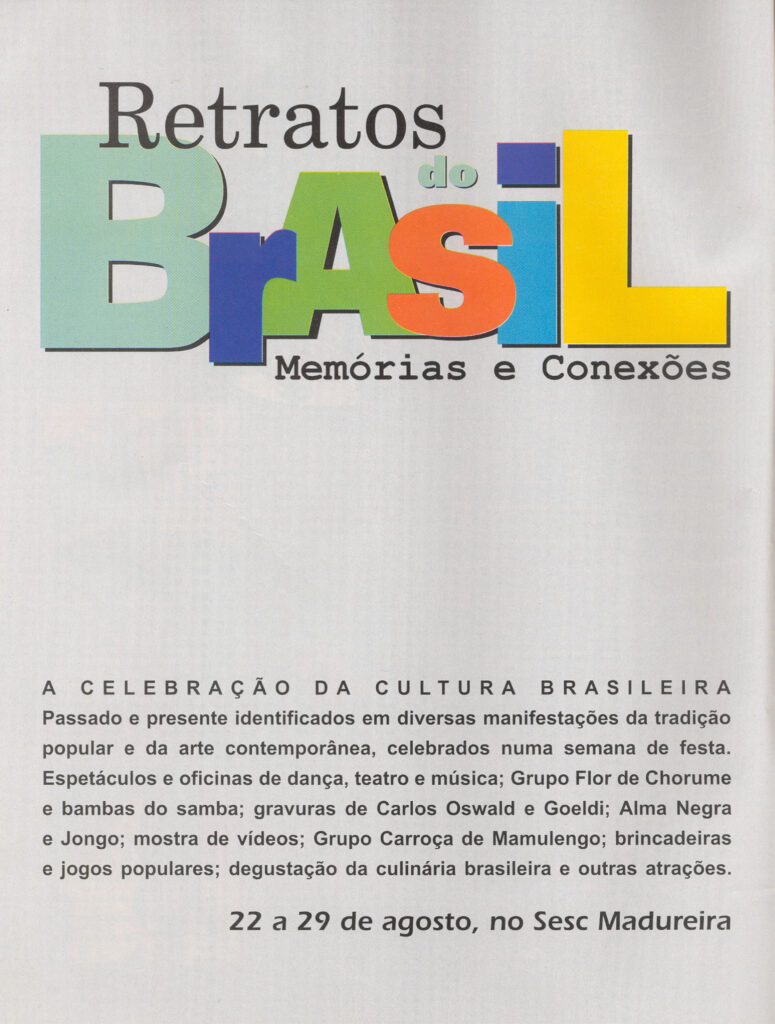 Em 2004, o Sesc Madureira adotou o conceito de cultura em perspectiva ampla como espaço de construção de saberes, costumes, crenças, valores – as formas como as pessoas se organizam em sociedade, se congregam, produzem seus artefatos e alimentos, enfim celebram. Com edição anual, Retratos do Brasil buscou expandir as fronteiras formais em vista das inúmeras possibilidades de abordagem que o tema oferece e apresentar manifestações que dialogam com aspectos contemporâneos, em encontros que reuniram várias linguagens expressivas como teatro, música, dança, artes visuais.