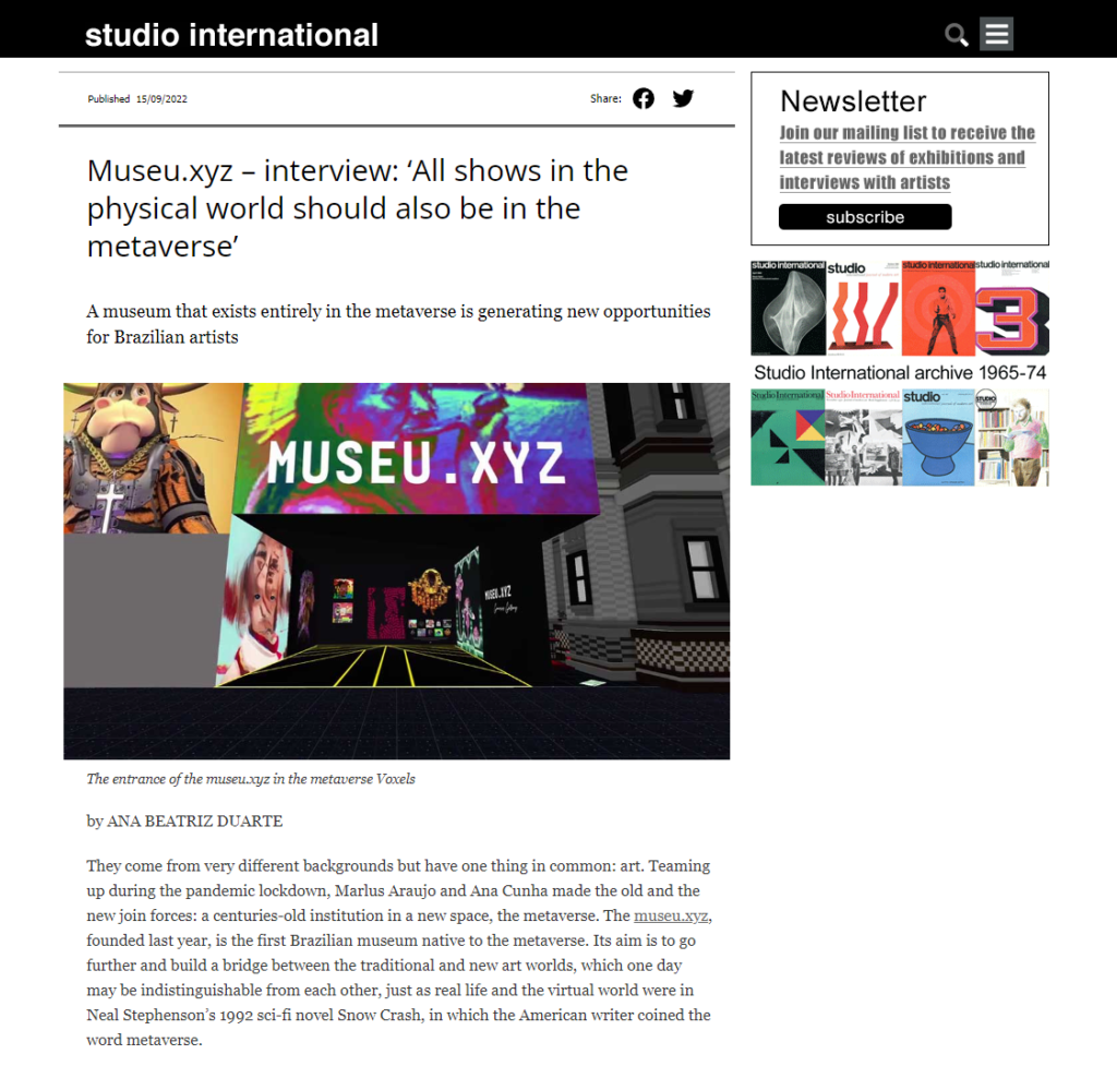 Clique aqui e leia a entrevista com Ana Cunha e Marlus Araujo, publicada em setembro pela revista Studio International.