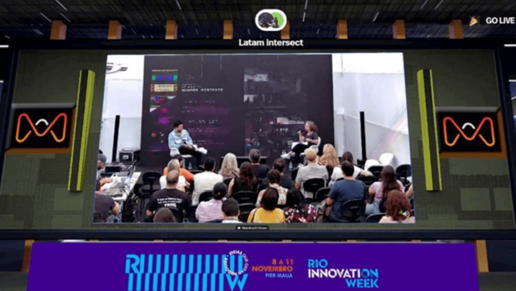 A convite da MetaMundi, participamos de uma mesa no RIW22. Ana Cunha (gestora cultural do Museu.xyz) e Diogo Toledo (Analista de Arte, Ciência e Tecnologia do Sesc Tijuca) apresentaram os resultados da Ocupação Metaverso e Arte.