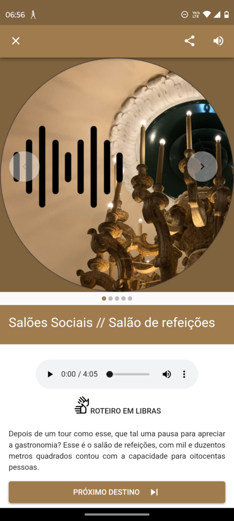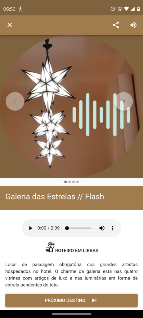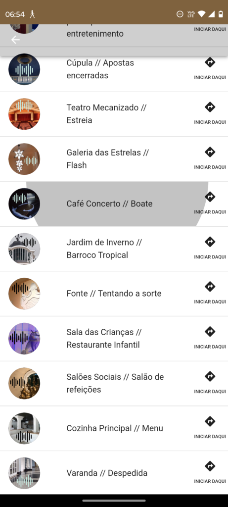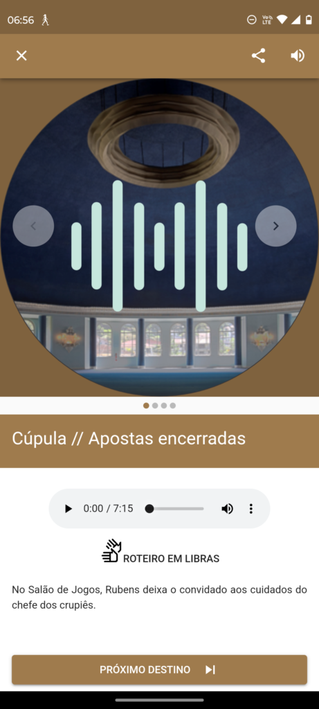 O roteiro explora o setor de entretenimento e cultura do antigo hotel-cassino, com acesso pela ala posterior, à direita do palácio. Nesta etapa do Sons da Memória, a caminhada sonora inclui quatro ambientes. Do Hall Monumental, o visitante percorre o Salão de Jogos, a Galeria das Estrelas e o Jardim de Inverno, conhecendo detalhes do ambiente e da decoração, além de curiosidades. Em cada um desses espaços, novos personagens surgem, enriquecendo a narrativa.